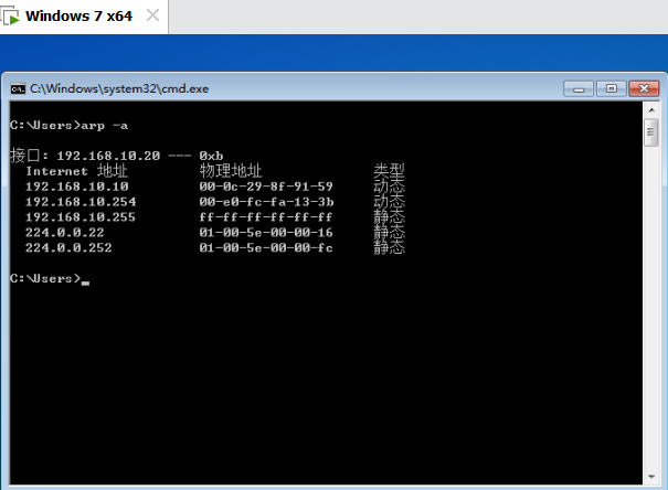 3.1 查看win7中arp表 目的:和实验抓包做比对