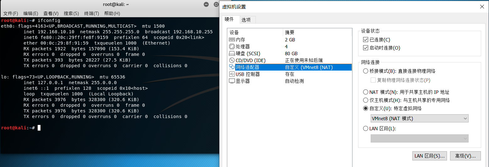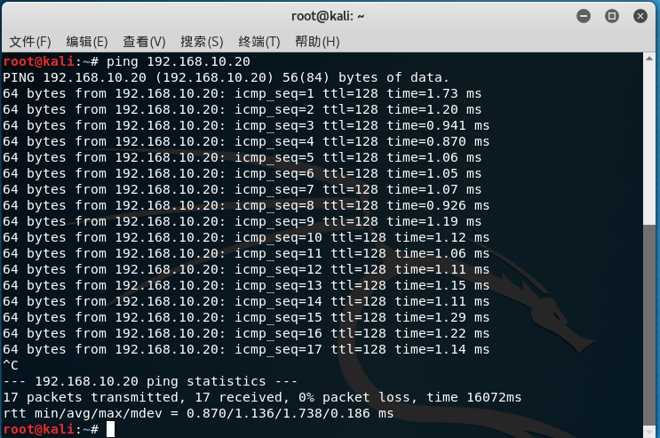 ping 192.168.10.10 目的:测试与kali之间的网络连通