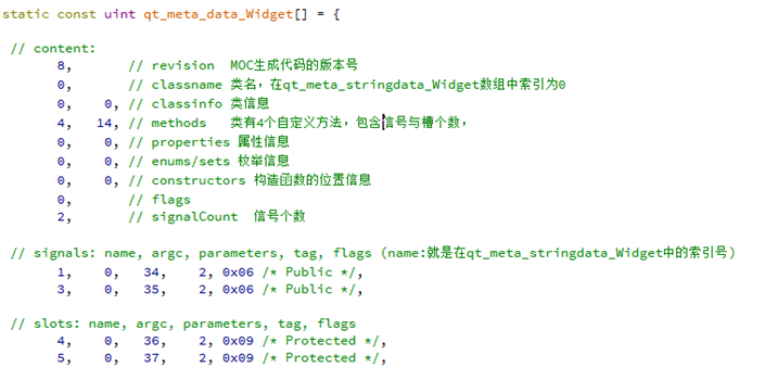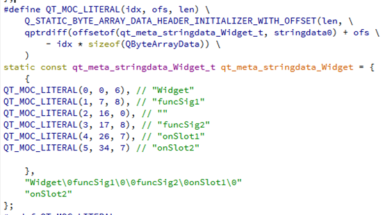 然后生成一个qt_meta_data_Widget(由于类名是Widget,所以后缀是Widget)数组: