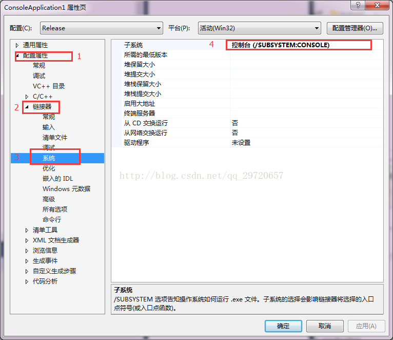 在工程上右键--->属性--->配置属性--->链接器--->系统--->子系统(在窗口右边)--->下拉框选择控制台(/SUBSYSTEM:CONSOLE)。