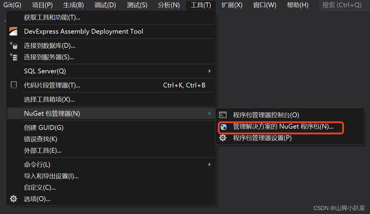 找到菜单栏:工具➡️NuGet包管理器➡️管理解决方案的NuGet程序包