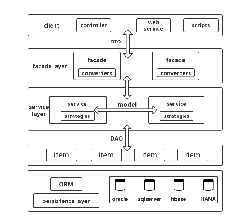 service指的是很细粒度的、商务上所需要的各种方法,,比如计算总价、对数据库进行的CRUD等。在hybris已有的系统中我们会找到非常多类型的hybris接口定义。service层将数据整理好以后,会以model的形式暴露给façade层来使用,不同的service之间也通过model来传递数据。