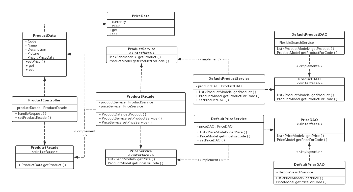 其中façade代替了service来与controller进行通信,并且调用service来获取所需要的model并转化为controller所需要的DTO(图中的ProductData与PriceData)