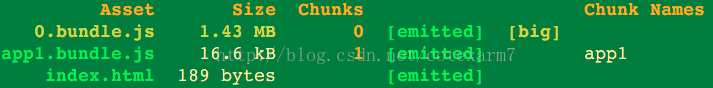 由上图可以看出:dist中有2个js文件,其中app1.bundle.js是index.html中引入的文件,0.bundle.js是app1.bundle.js依赖的文件,其在运行时动态加载。通过这种引入方式,加快了页面执行的速度。