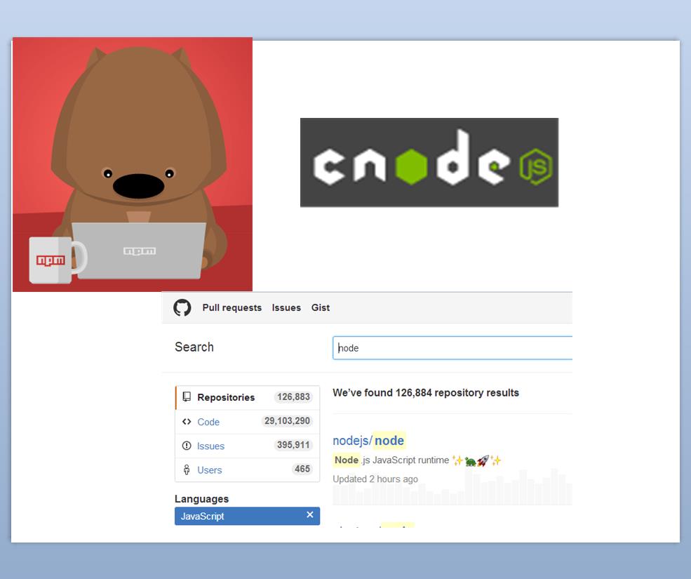这张图描述的是node.js周边的一些信息,比如npm这个出色的包管理器和cnode社区以及github,都在一定程度上促进了node.js的繁荣,提供了技术保障。