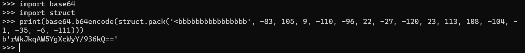 print(base64.b64encode(struct.pack('<bbbbbbbbbbbbbbbb', -83, 105, 9, -110, -96, 22, -27, -120, 23, 113, 108, -104, -1, -35, -6, -111)))