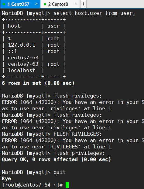 以上就是风趣龙猫最近收集整理的关于远程连接mysql服务器报错ERROR 1130 (HY000): Host ‘ip‘ is not allowed to connect to this MariaDB server的全部内容,更多相关远程连接mysql服务器报错ERROR内容请搜索靠谱客的其他文章。