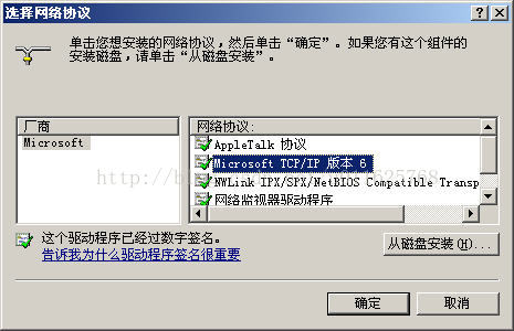 第二步:点击“安装”按钮,出现“选择网络组件类型”对话框,选择“协议”选项后,点击“添加”按钮,出现如图2的“选择网络协议”对话框,选择“Microsoft TCP/IP 版本6”,最后点击“确定”按钮。