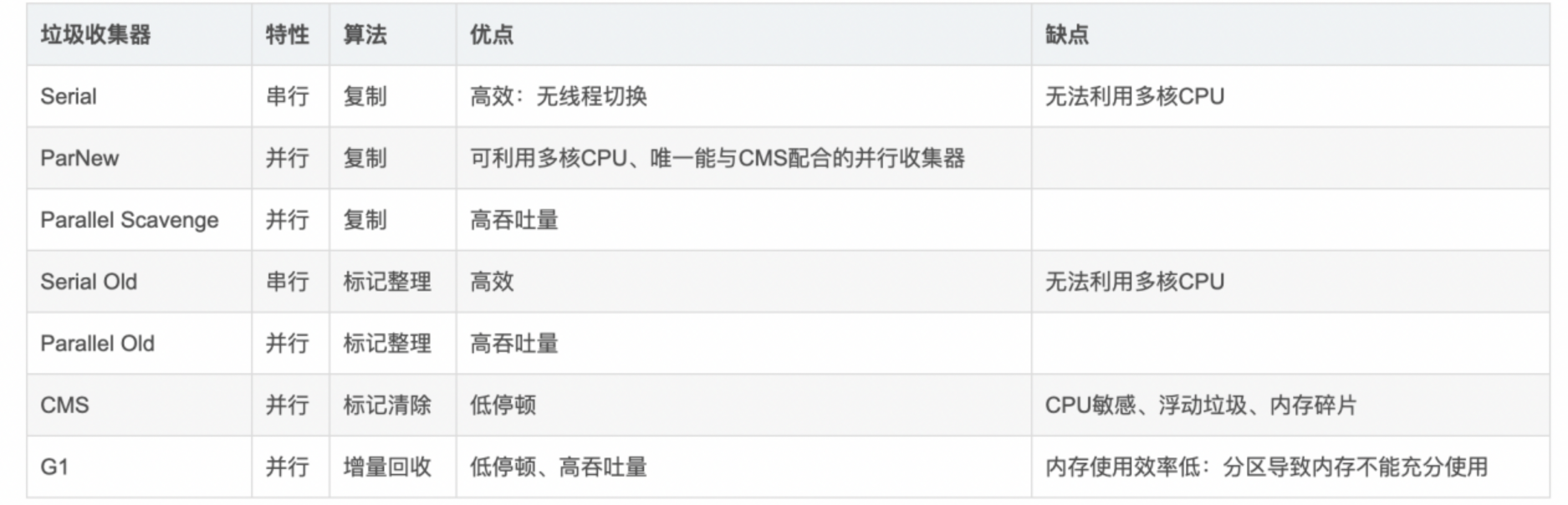 - Serial 收集器、ParNew 收集器、Parallel Scavenge 收集器、Serial Old收集器、Parallel Old 收集器、CMS 收集器、G1收集器