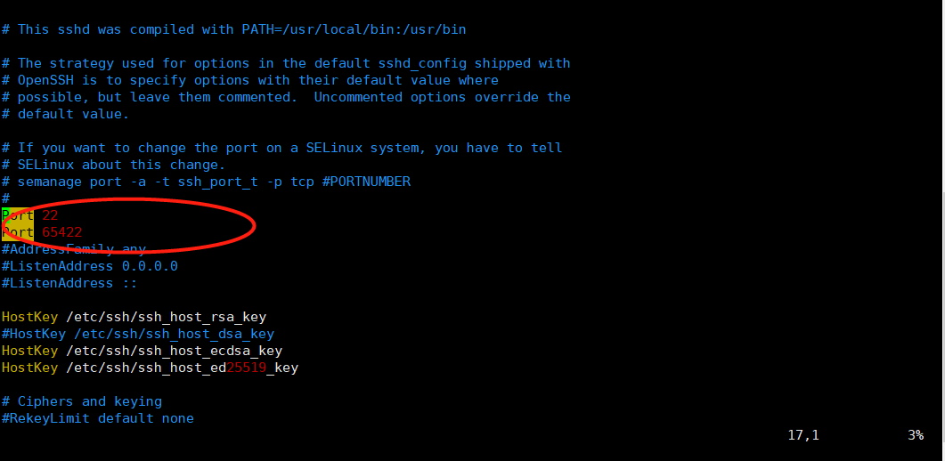 找到“#Port 22”,这一行直接键入“yyp”复制该行到下一行,然后把两行的“#”号即注释去掉,修改成: