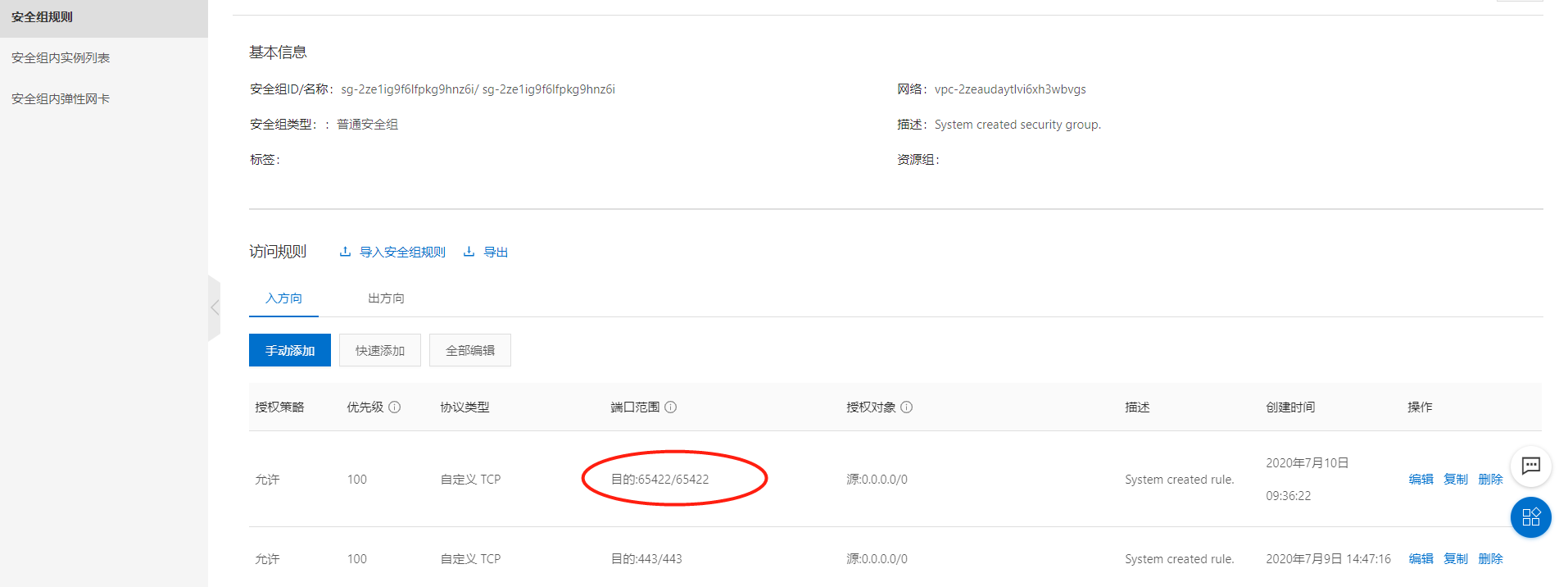 增加65422端口,并且删除原有22端口,确保安全性;