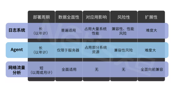 - 日志系统和Agent部署周期都比较长,一般以年或月为单位,而网络抓包周期相对比较短,一般以周或月为单位;