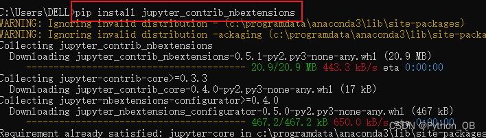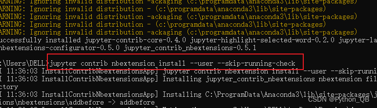 2.安装完成后,继续输入jupyter contrib nbextension install --user --skip-running-check