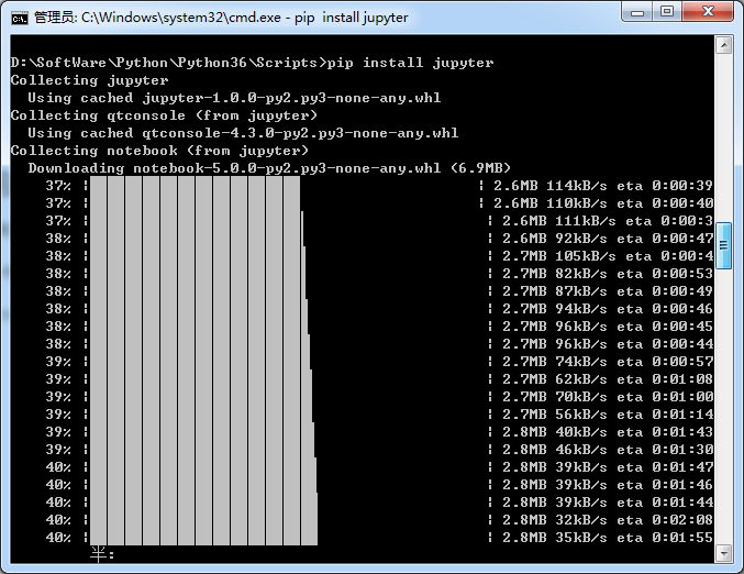 Microsoft Windows [版本 6.1.7601] 版权所有 (c) 2009 Microsoft Corporation。保留所有权利。 C:UsersAdministrator>cd /d D: D:>cd D:SoftWarePythonPython36Scripts D:SoftWarePythonPython36Scripts>pip install jupyter