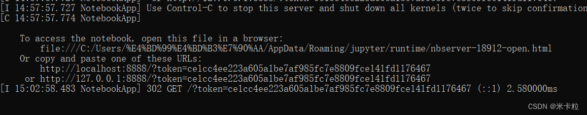 [I 15:02:58.483 NotebookApp] 302 GET /?token=ce1cc4ee223a605a1be7af985fc7e8809fce141fd1176467 (::1) 2.580000ms
