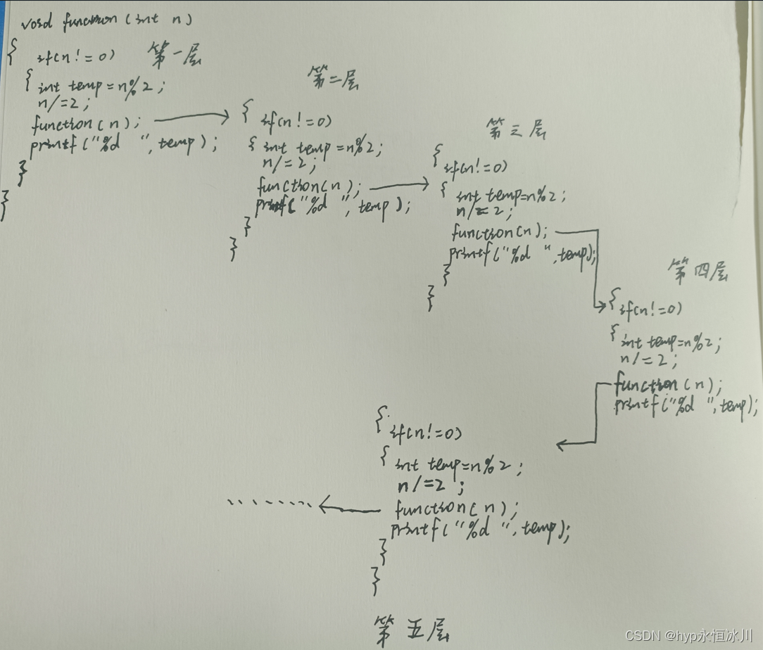 若n=10,则应该输出的二进制数为1010,此时的temp==0假如把函数开始作为第一层,执行到function(n)时进入第二层此时n==5,temp==1执行到function(n)时进入第三层,此时n==2,temp==0再次执行到function(n)时,进入第四层,此时n==1,temp==1再次执行到function(n)时,进入第五层,此时n==0,此时n不满足if(n!=0){}的条件,第五层结束返回第四层,接着执行printf()语句也就是输出1,执行结束后返回第三层接着输出0,输出完毕接着返回第二层输出1,输出完毕返回第一层输出0,然后整个函数结束,像这样一个过程就是递归的过程。