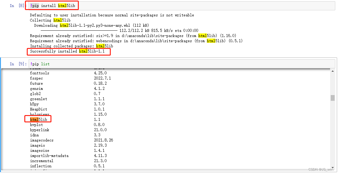 3.如果你需要库未安装则可以通过:!pip install packagename来安装某个库,例如安装:html5lib库,效果如下图