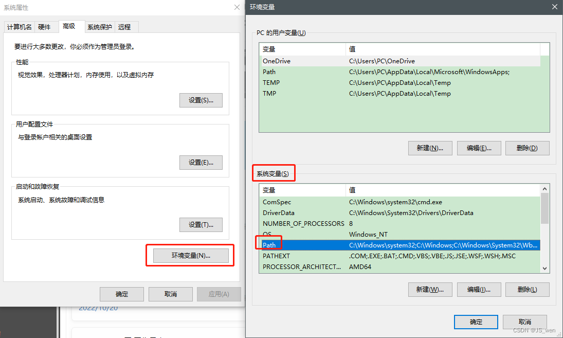 ④点击“环境变量”-在“系统变量”里找到“path”并双击添加一下三个文件夹路径