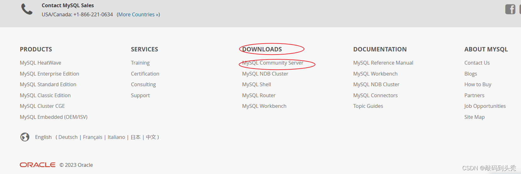 在MySQL官网www.mysql.com中下滑到底部,在【downloads】中选择【MySQL community server】进入下载页面