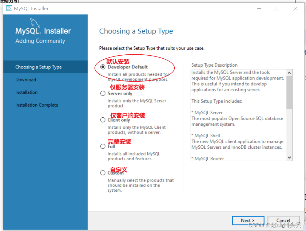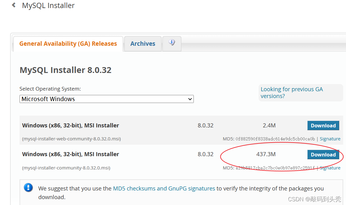 PS:选择installer进入页面再下载,不要在下方直接下载,下方下载的是MySQL的内容,不是安装程序,若误删了MySQL的某个文件则可以从此处下载。