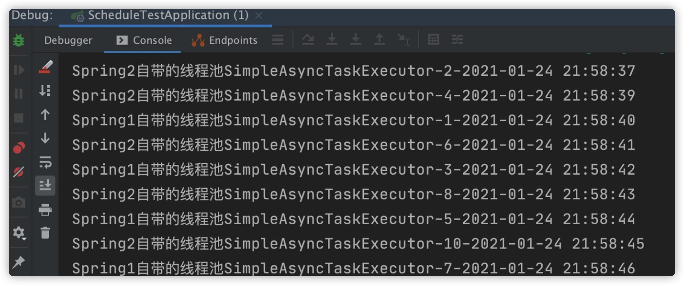 System.out.println("Spring2自带的线程池" + Thread.currentThread().getName() + "-" + sdf.format(new Date()));