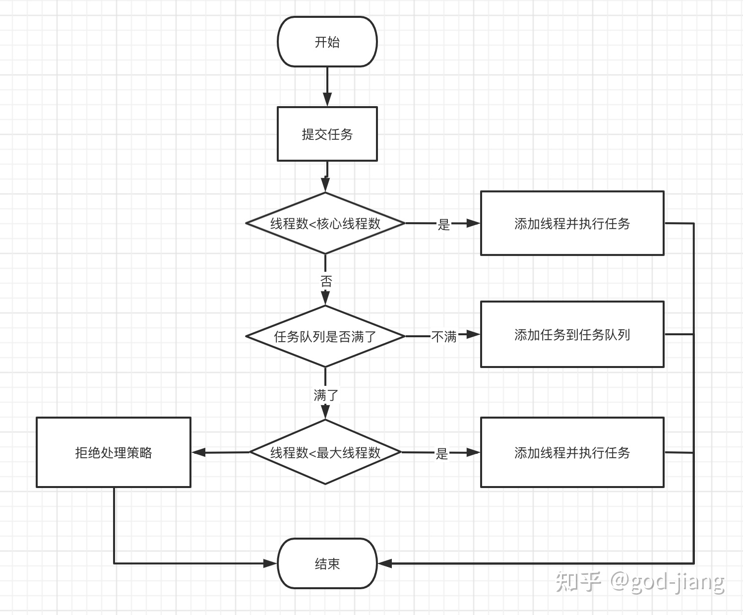 - 查看线程池是否已满,即就是是否达到最大线程池数,不满就创建一条线程执行任务,否则就按照策略处理无法执行的任务。