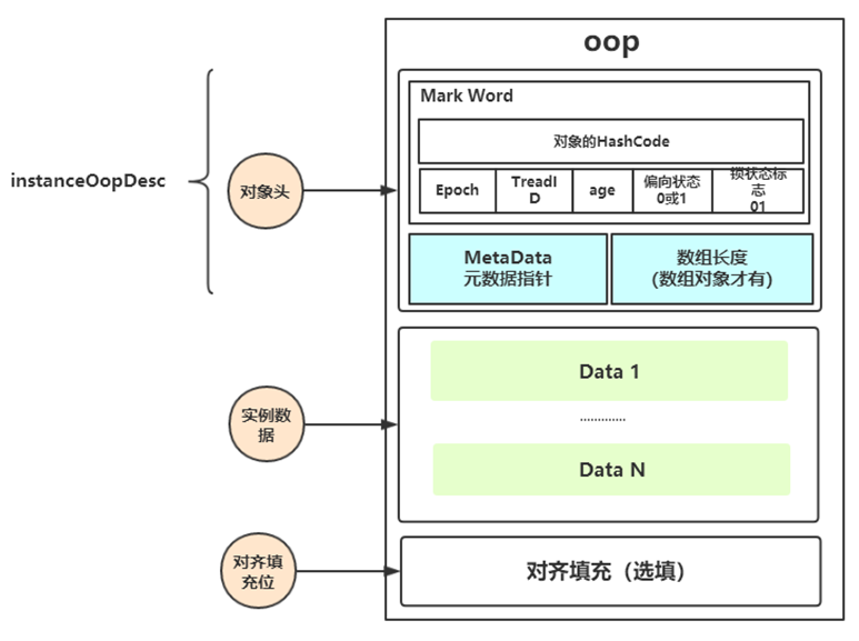 对象 = 对象头 + 对象实例数据(instance data) + 对齐填充(padding)