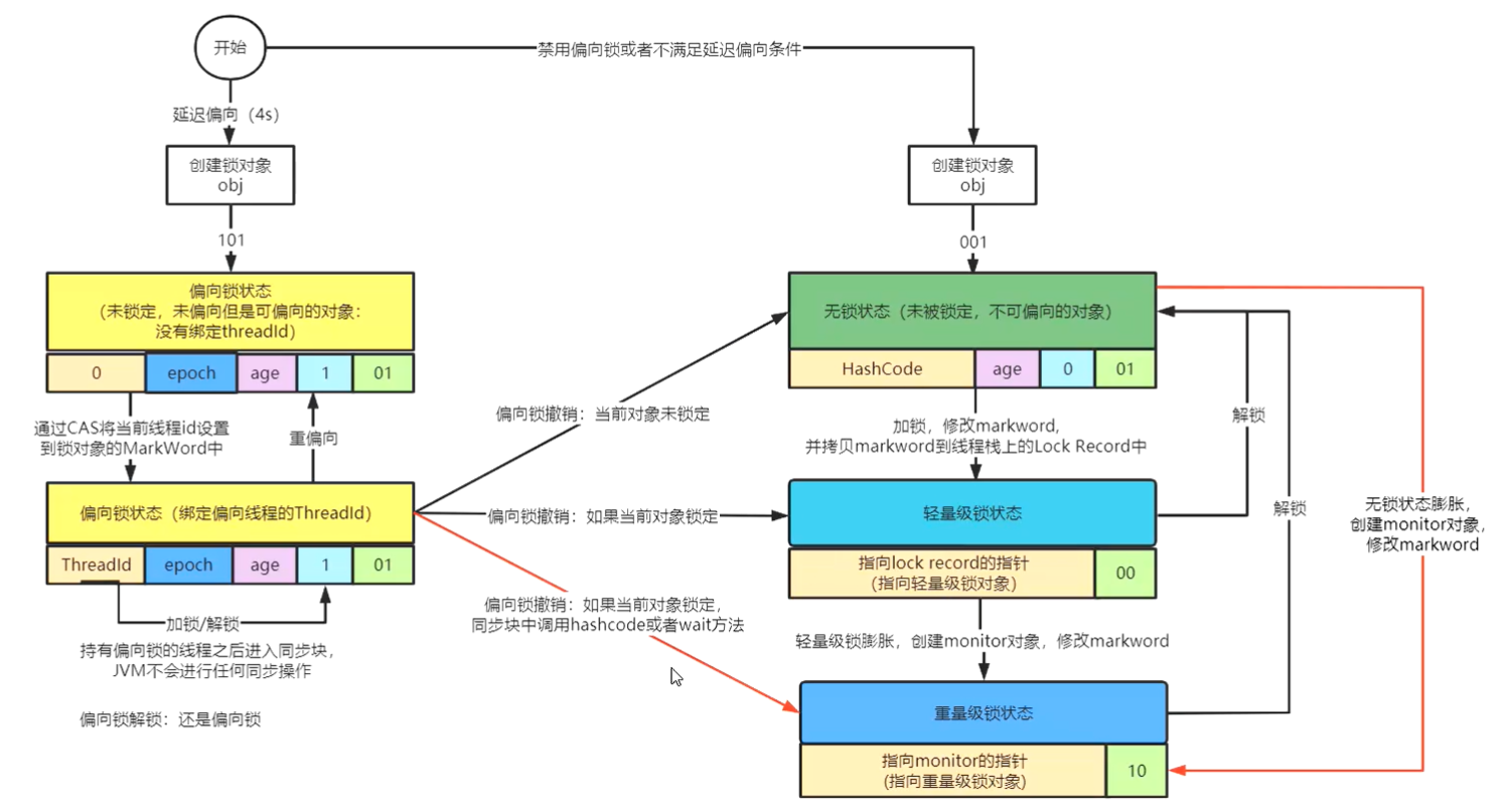 如:并发大的场景下,由偏向锁变为轻量级锁可以修改为由无锁变成轻量级锁。前者在偏向锁状态下,会不断的CAS自旋,然后进行偏向锁撤销,然后变成轻量级锁;后者直接由无锁变成轻量级锁,更快更方便(流程图才看第⑤点中的图)