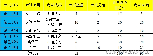 考试还为6个部分组成,分别为:交际英语、阅读理解、词汇语法、完型填空、英译汉、作文。