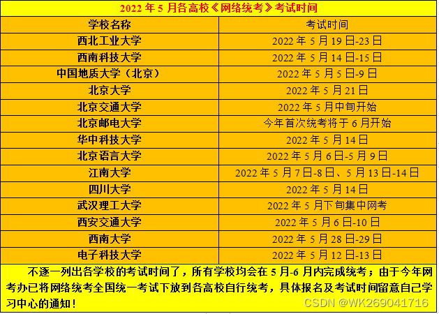 由于今年起统考已经下放到各高校自行统考,所以在报名时间、考试时间、成绩发布等...留意自己学习中心的通知。