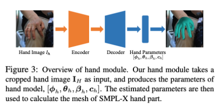 输入为裁剪好的局部手掌区域,对于左手会进行额外的处理,左手的图像首先被翻转和处理成和右手一样,输出的结果会逆向回到左手的表示空间。整个训练框架参考HMR,通过resnet-50进行特征提取,然后采用多层全连接来进行参数回归参数。基于SMPL-X可以得到21*3的3D手部关节坐标,通过学习到的正交投影参数s和t,得到关于手部的2d坐标。训练细节:一共存在三种标注信息,一种是fitting的到的smpl-x参数,一种是采集得到的真实空间的3d点,一种是2d点。这样训练过程中存在三种loss。特别地,2D关键点损失被用来估计相机参数,并便于手模块推广到只有2D关键点注释的野外成像。关于shape的监督,我们在使用FreiHAND数据集的时候,不使用其提供的shape参数,因为这些是为MANO模型[58]定义的,与SMPL-X中的手模型不兼容(SMPL-X应该是提供了转换机制)。