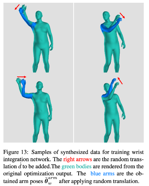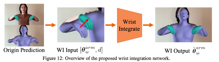 可以发现手部模块输出的mesh与原图的贴合度很好,但是讲手掌整合到全身后,贴合度就会变差,手腕集成网络的作用是调整手臂的姿态,将手移动到手模块所确定的位置。因此可以认为手模块预测的位置上正确的,将手模块输出的手pose转接到身体模块会导致手部贴合度下降,希望通过调整肩膀和手肘的pose来影响手腕的空间位置。因此手腕整合网络的输入为关于整个手臂的pose和一个二维向量,这个二维向量是计算手部输出的手腕2d点和整合后的手腕2d点之间的图像空间位移关系,并且给予手臂长度进行归一化。整个手臂pose为复制粘贴集成后肘关节和肩关节的位姿参数。因此可以理解增加了一个手臂网络模块。原始的肩位姿θsw和肘位姿θew均为人体骨骼运动学中定义的相对于其参数的局部旋转。为了简化腕部整合网络的训练,我们将肩部姿态转换为全局姿态φsw,这样腕部整合网络就不需要考虑身体其他部位的姿态。肘部的姿势保持为局部旋转。这样输入为全局的肩关节和局部手肘关节,以及手腕位移向量。输出则是认为正确的全局的肩关节和局部手肘关节。