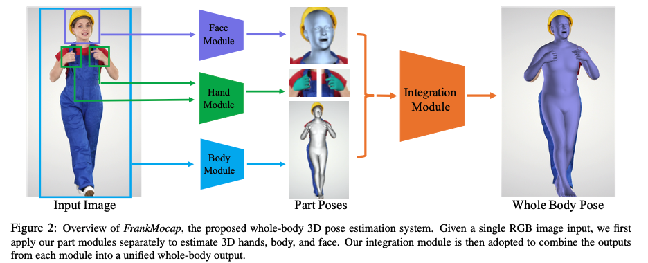 然而,估计整个身体的3D姿势,包括脸和手,仍然是一个挑战。其中一个主要的困难来自于脸和手的尺寸远小于躯干和四肢的尺寸。此外,在运动中的手容易受到由突然的视点变化、自我遮挡和运动模糊造成的伪影。这些因素极大地增加了用全身3D姿势创建大规模数据集的难度。缺乏全身三维数据是阻碍建立统一的全身三维姿态同时估计系统的主要障碍。我们的系统建立在这样一种认识之上:训练一个单一的模型来联合估计整个部分本质上是受到缺乏准确和多样化的全身运动数据的限制的。相反,我们设计了一个模块化的系统,首先独立运行面部、手部和身体的三维姿态回归方法。然后通过集成模块组合这三个回归输出。