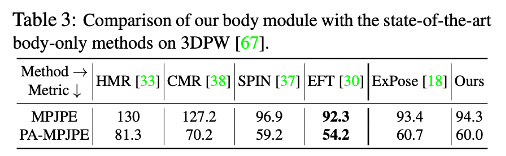 2 我们的body模块可与以前的先进水平相媲美,包括ExPose[18]。我们的身体模型是一个微调版本的SPIN[37]和EFT[30]。略微下降的性能可能是由于我们只使用较少的数据集,COCO和Human3.6M数据集。我们只比较了基于HMR[33]的方法。我们认为,如表3所示的实验结果可以证明,将以往基于smpl的方法扩展到基于SMPL-X的body模块是可行的。由于我们的模块化设计,我们也可以轻松地利用最新的3D身体。