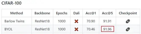 因为从solo-learn公开的测试结果来看,BYOL在相似的领域图片数据集上Top5的表现是最好的(皮肤也是相似的领域图片数据):