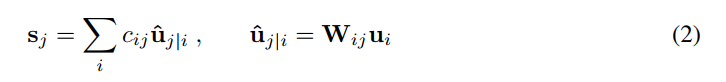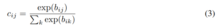 其中,$c_{ij}$ 是在迭代的动态路由过程中决定的耦合系数(coupling coefficients)。
