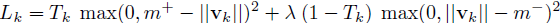 我们使用实例化向量的长度来表示一个胶囊的实体存在的可能性。当且仅当图像中有数字时,我们想要得到数字类k的顶层的胶囊来获取一个长的实例化向量。为了允许多个数字,我们对每个数字胶囊k使用一个单独的边缘损失