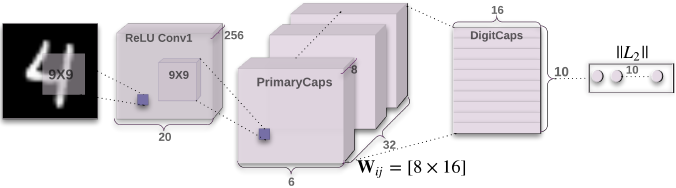 第二层(PrimaryCapsules)是一个卷积的胶囊层,卷积的8维胶囊的32个通道(即每个基本胶囊包含8卷积单元,用一个9×9的核和一个2的步长)。每个初始胶囊的输出看作是所有256×81Conv1单元,这些单元可以容纳与胶囊的中心位置重叠的区域。总的PrimaryCapsules有[32×6×6]胶囊输出(每个输出都是8维向量),每个胶囊都在[6×6]的网格中互相共享权重。PrimaryCapsules作为卷积层用公式1表示,作为其的块非线性。最终层(DigitCaps)有每个数字类是一个16维,这些胶囊的每一个都是从低一层的所有胶囊中接收到输入。