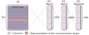 图2.重建一个来自DigitCaps层表示的数字的解码结构。图像间的欧式距离和Sigmoid层的输出在训练中最小化。我们用正确的标签在训练中作为重建目标。