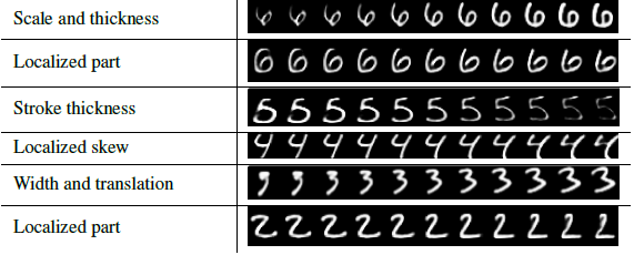 图4. 维数扰动。每一行显示了当在DigitCaps表示中的16维中的一个是在范围[-0.25,0.25]间以间隔为0.05的扭曲。