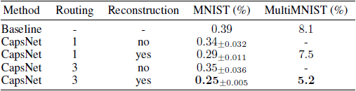 表1. CapsNet分类测试精确度。从三组实验中得到MNIST平均值和标准偏差结果。