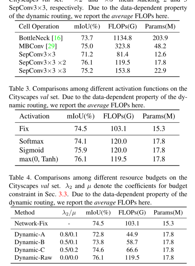 为了和先前的架构进行公平的比较,只有基本的卷积操作和身份映射(identity mapping)。几个典型操作的实验结果,包括瓶颈[16] ,mbconv [29] ,sepconv [8]在表2中。我们发现叠加两个 sep 3 × 3进行特征变换时,动态网络的性能最好,重运算对增益的贡献不大。我们猜测这可能是因为路由体系结构比较繁重的操作起着更重要的作用。实际上,当分辨率为1/4时,我们也进行了较大内核(例如,sep conv5 × 5)的实验,但只发现了0.2% 的绝对增益。因此,为了简便起见,本文只使用了 sep3 × 3。