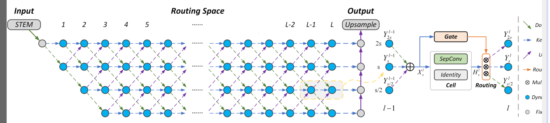 为了释放动态路由的潜力,我们在相邻层之间提供完全连接的路径,但是有一些先验约束,例如,单元之间的上采样或下采样跨度,如图2所示。具体来说,根据网络设计中的常见做法,网络的开始是一个固定的3层“STEM”块,这将分辨率降低到1/4比例。在那之后,一个有层的空间被设计为动态路由,称为路由空间。在路由空间中,相邻单元间的比例因子被限制为2,这是基于ResNet的方法中广泛采用的方法。因此,最小比例设置为1/32。在这些约束条件下,每个层次的候选数最多可达4人。