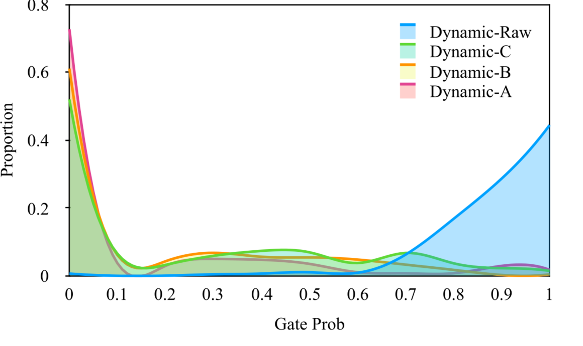此外,我们提出了路由激活概率的分布图5。很明显,大部分路径都是动态原始的。如果给定资源预算,路线的不同比例将被降低,这可以从图5中的分布中了解到。