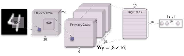 图 1:一个简单的 3 层 CapsNet。该模型的结果与深度卷积网络(如 Chang and Chen [2015])差不多。DigitCaps 层中每个 capsule 的活动向量(activity vector)的长度代表出现的每个类别的样例,用于计算分类损失。W_ij 是 PrimaryCapsule 中每个 u_i 之间的权重矩阵,i ∈ (1, 32 × 6 × 6),v_j,j ∈ (1, 10)。