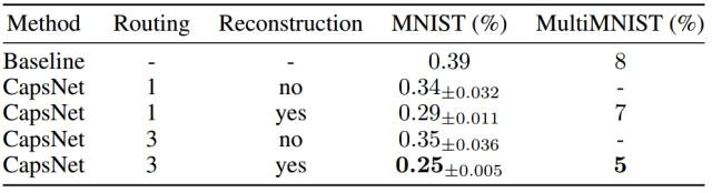 表 1:CapsNet 分类测试准确度。其中 MNIST 均值和标准差都是根据三个试验计算而出。