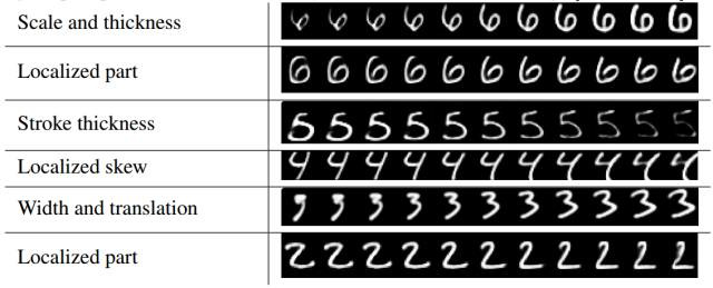 我们发现 capsule 中的一个维度(所有 16 个维度中)几乎总是可以表征数字的宽度。而多个维度可以表征全局变化的组合,还有其它一些维度可以表征数字的局部变化。