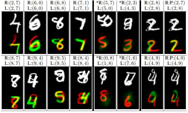 两个重构数字以绿色和红色重叠位于图下方。图上方展示了输入图像。L:(l1, l2) 表示图中输入的两个数字的标签,R:(r1, r2) 表示重构的两个数字。最右两列展示了两个错误重构的例子,分别从标签和预测(以 P 标记)重构。在(2,8)的例子中,模型混淆了 8 和 7,在(4,9)的例子中,模型混淆了 9 和 0。其它列都给出了正确的分类结果,表明模型能考虑所有的像素并决定每个像素如何分配给两个数字,即使是在相当困难的情景下(第 1—4 列)。注意数据集生成的时候,像素的值都简化为 1。带*号的两列展示了既不是从标签也不是从预测重构的数字的结果。这些结果表明模型不止是为图像中的所有(包括未出现的)数字寻找最佳拟合。因此,在(5,0)的例子中,它无法重构出一个 7,因为它知道 5 和 0 拟合得最好,并且模型已经考虑了所有的像素。同样,在(8,1)的例子中,数字 8 中的环并不会使模型指向 0,因为它已经考虑了 8。所以,如果其中一个没有任何其它的支持线索,模型不会将一个像素分配给两个数字。