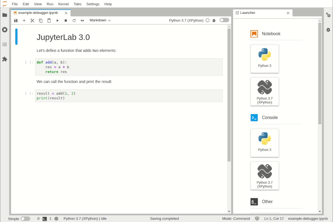 去年,JupyterLab已经加入可视化调试器,不过需要用户手动额外安装,现在该功能默认与JupyterLab一起提供。