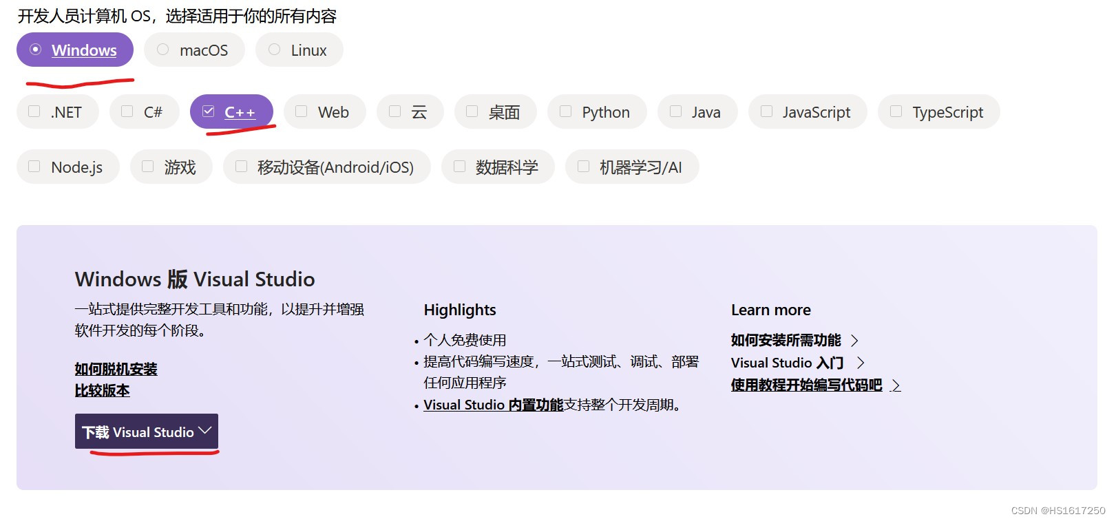 勾选使用C++的桌面开发